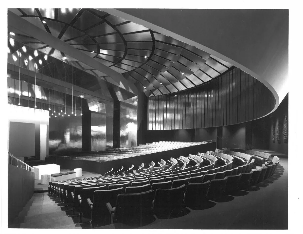 Mah told a Commecial Appeal reporter 50 years ago how his design sought to enhance the spirituality of the space. Covering the sanctuary surfaces with reflective material was intended to “dematerialize” the space “so that you never are conscious of the limits of the space,” he said.